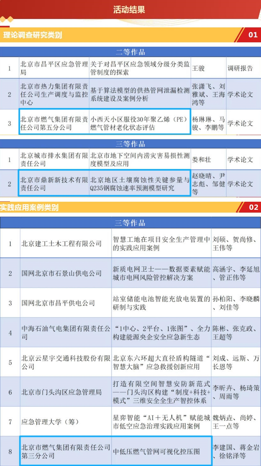 經(jīng)過(guò)線(xiàn)上線(xiàn)下多輪專(zhuān)家評審,北京市燃氣集團有限責任公司第五分公司(團隊成員:楊琳琳、馬駿、李鵬等)申報的《小西天小區服役30年聚乙烯(PE)燃氣管材老化狀態(tài)評估》榮獲理論調查研究類(lèi)二等作品,北京市鼎新新技術(shù)有限責任公司(團隊成員:趙曉晴、尹志彪、鄒健等)申報的《北京地區土壤腐蝕性關(guān)鍵參量與Q235鋼腐蝕速率預測模型研究》榮獲理論調查研究類(lèi)三等作品,北京市燃氣集團有限責任公司第三分公司(團隊成員:李建國、蔣金巖、徐銘澤等)申報的《中低壓燃氣管網(wǎng)可視化控壓圖》榮獲實(shí)踐應用案例類(lèi)三等作品。此次活動(dòng),集團在參賽企業(yè)系統中成績(jì)突出,并在活動(dòng)成果匯演中登臺,全面展示集團在保障城市安全穩定運行中發(fā)揮的重要作用。